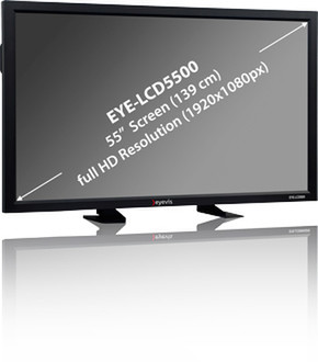 eyevis EYE-LCD5500-LHD. Bildschirmdiagonale: 139,7 cm (55 Zoll), Display-Typ: LED, Bildschirmauflösung: 1920 x 1080 Pixel. Produktfarbe: Schwarz, VESA Montageadapter: 400 x 400 mm. Stromverbrauch (typisch): 237 W, Stromverbrauch (Standby): 1 W, AC Eingangsspannung: 100 - 240 V. Breite: 1265,8 mm, Tiefe: 46,2 mm, Höhe: 736,6 mm. Paketgewicht: 37 kg