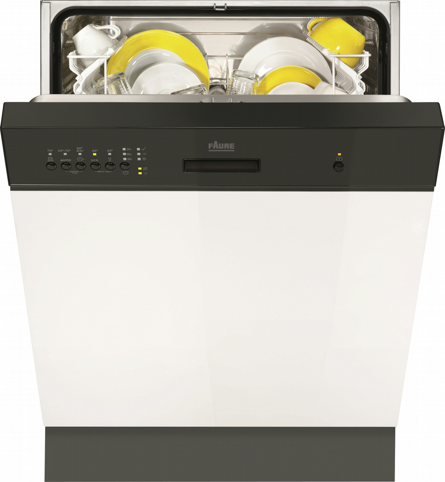 Faure FDI15005NA. Typ: Integrierbar, Bedienfeld Farbe: Schwarz, Kontrolltyp: Knöpfe. Trocknung Kategorie: A, Wasch-Kategorie: A, Geschirrspülprogramme: Auto 45-70 ºC, Glas/Filigran, Intensiv. Energie-Effizienzklasse: A+, AC Eingangsspannung: 220 - 240 V