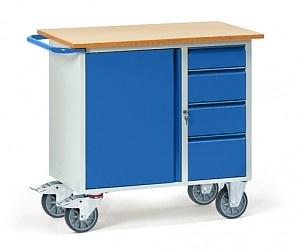 Stahlblech-Konstruktion, pulverbeschichtet, Korpus lichtgrau RAL 7035, Front blau RAL 5007. Mit 1 Stahlschrank, 1 festen und 2 verstellbaren Böden und 4 Schubladen (H x B x T i.L.: 1 Stk. 105 x 280 x 470 mm, 2 Stk. 160 x 280 x 470 mm, 1 Stk. 210 x 280 x 470 mm). Zentralverschluss mittels Zylinderschloss. Arbeitsfläche Sandwich-Platte 19 mm stark. 2 Lenk- und 2 Bockrollen, TPE-Bereifung, Naben mit Rillenkugellager. Feststeller an den Lenkrollen, gemäß der Europäischen Norm EN 1757-3 (Sicherheit von Plattformwagen). Tragkraft pro Einlegeboden im Stahlschrank 80 kg, pro Schublade 35 kg.