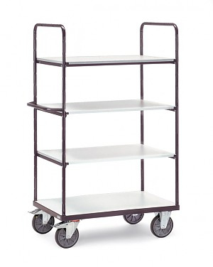 Elektrisch leitfähige Ausführung. Stahlrohr und Profilstahl geschweißt, elektrisch leitfähig pulverbeschichtet, schiefergrau RAL 7015. Schraub- und Steckkonstruktion. 1 fester und 3 lose Böden aus elektrisch leitfähiger Holzwerkstoffplatte nach DIN 68765, hellgrau. 2 Lenk- und 2 Bockrollen, Räder mit TPE-ESD-Bereifung (thermoplastisches Elastomer), elektrisch leitfähig. Naben mit Präzisions-Rillenkugellager. Höchster Komfort: Sehr geringer Anfahr-, Roll- und Schwenkwiderstand. Geräuscharmer Lauf auf ebenen Böden. Reifen nicht kreidend (spurlos). Feststeller an den Lenkrollen, gemäß der Europäischen Norm EN 1757-3 (Sicherheit von Plattformwagen). Tragkraft pro Einlegeboden 50 kg.
