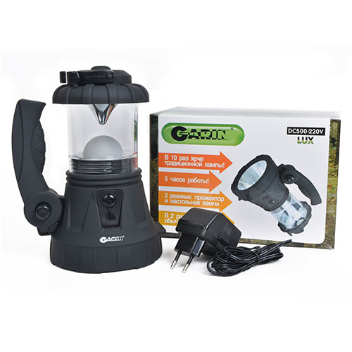 GARIN DC500-220V, LUX. Produkttyp: Batteriebetriebene Campingleuchte, Produktfarbe: Schwarz. Lampentyp: LED, Lampenleistung: 1 W, Equivalente Glühlampenleistung: 20 W. Energiequelle: Batterie/Akku, Aufladequelle: AC, Zigarettenanzünder, Batterietechnologie: Lithium-Ion (Li-Ion). Verpackungsart: Box
