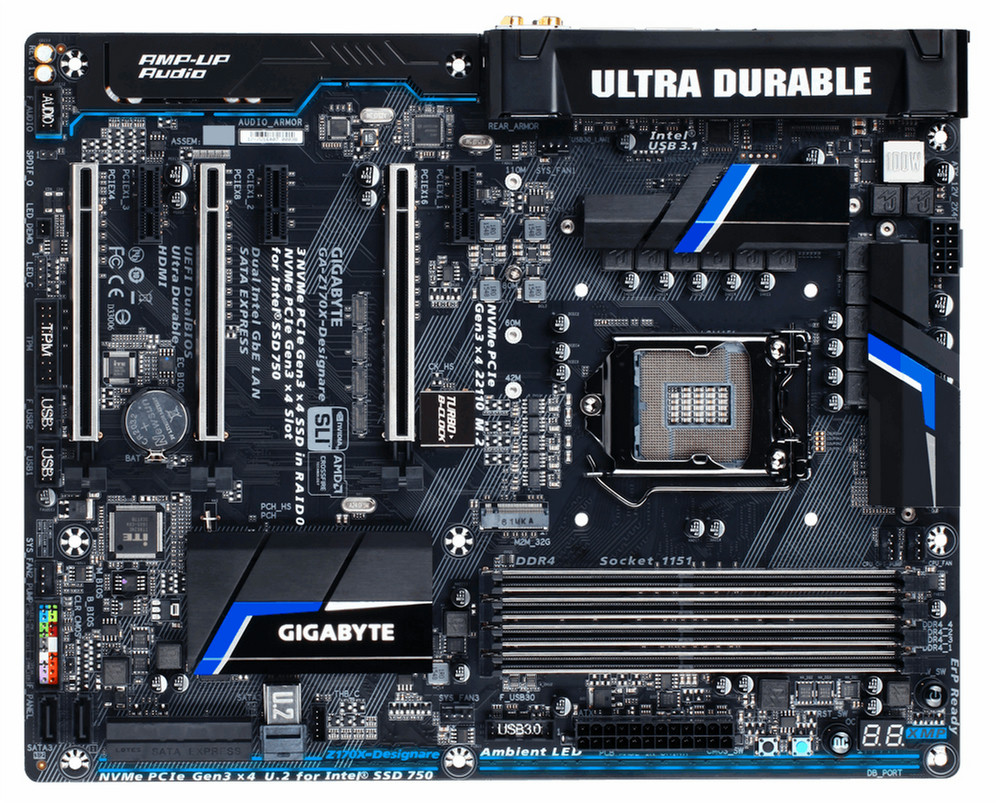 Gigabyte GA-Z170X-Designare. Unterstützte Arbeitsspeicher: DDR4-SDRAM, Arbeitsspeicher Typ: DIMM, Unterstützte Arbeitsspeichergeschwindigkeit: 2133,2400,2666,2800,3000,3200,3300,3333,3400,3466,3600,3666,3733,3800,3866,4000 MHz. Prozessorfamilie: Intel, Kompatible Prozessoren: Celeron,Core i3,Core i5,Core i7,Pentium, Prozessorsockel: LGA 1151 (Socket H4). Unterstützte Speicherlaufwerk-Schnittstellen: M.2, Serial ATA III. Ethernet Schnittstellen Typ: Gigabit Ethernet. Komponente für: PC, Motherboard Chipsatz Familie: Intel, Motherboard Chipsatz: Intel Z170