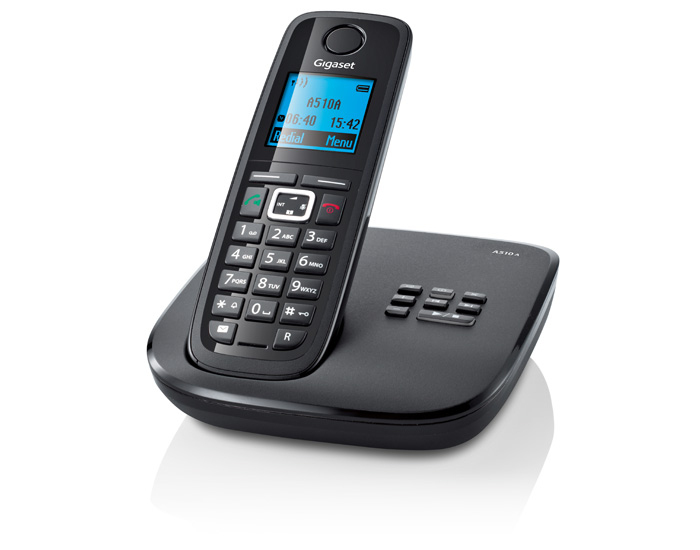 Gigaset A510A. Typ: DECT-Telefon, Aufnahmezeit: 25 min, Maximum Innenabstand: 50 m. Befestigungstyp: Tisch/Bank, Produktfarbe: Schwarz. Lautstärkeregler: Digital. Telefonbuch Kapazität: 150 Eintragungen. Anzeige: LCD, Bildschirmauflösung: 96 x 64 Pixel, Textzeilen: 3 Zeilen