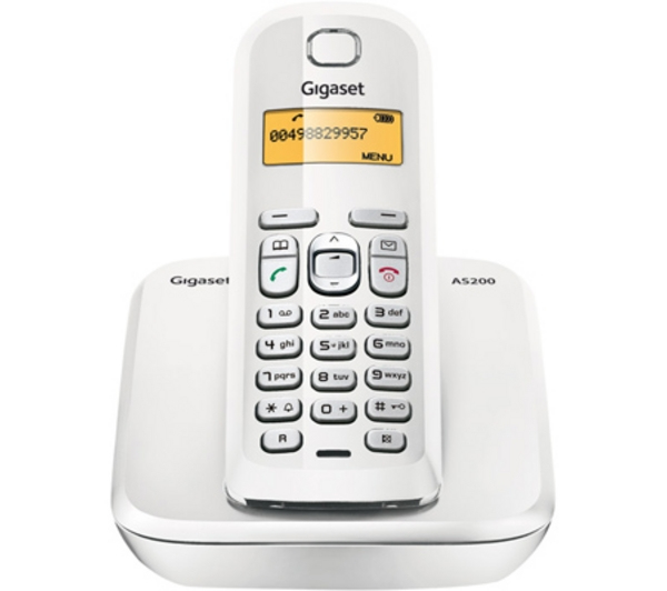 Gigaset AS200. Typ: DECT, Maximum Innenabstand: 50 m, Maximum Außenabstand: 300 m. Befestigungstyp: Tisch/Wand, Produktfarbe: Weiß. Lautstärkeregler: Digital. Telefonbuch Kapazität: 60 Eintragungen. Farbe der Hintergrundbeleuchtung: Bernstein, Bildschirmdiagonale: 3,81 cm (1.5 Zoll), Anzahl der Farben des Displays: Monochrom