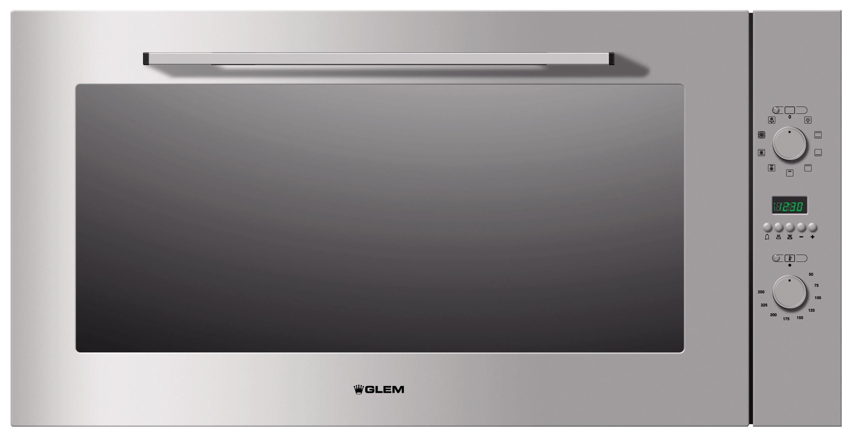 Glem GF9C93IXN. Ofentyp: Electric oven, Gesamtes Fassungsvermögen Garraum Ofen: 79 l, Innenkapazität des 1. Backofens: 79 l. Produktfarbe: Edelstahl, Kontrolltyp: Knöpfe, Rotation, Kontrollposition: Vorderseite. Energie-Effizienzklasse: A, Energieverbrauch (konventionell): 1,3 kWh, Energieverbrauch (erzwungene Konvektion): 0,98 kWh. Breite: 896 mm, Tiefe: 563 mm, Höhe: 480 mm