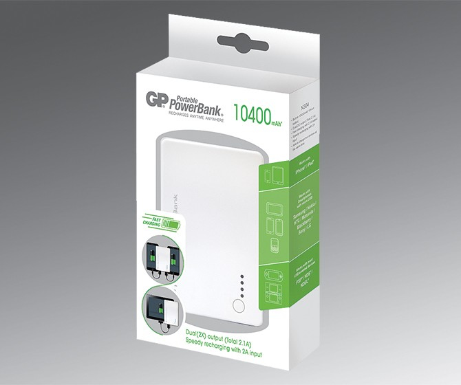 GP Batteries N304PE, Portable PowerBank. Produktfarbe: Weiß, Aufladekompatibilität: Digitaler Camcorder, Digitalkamera, MP3, Smartphone, Tablet. Batterietechnologie: Lithium-Ion (Li-Ion), Batteriekapazität: 10400 mAh, Aufladequelle: USB