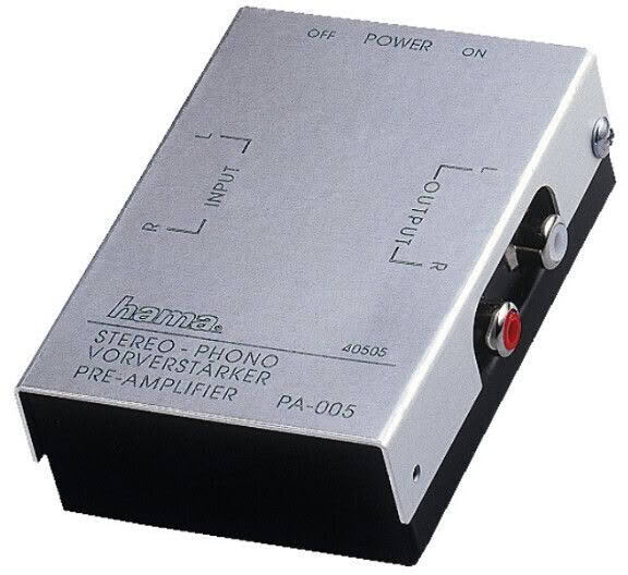 Bemerkung: wandelt Line-, AUX-, MD- bzw. CD-Eingänge in Anschlüsse für einen Plattenspieler mit Magnetsystem / ermöglicht Datentransfer vom Plattenspieler auf einen PC / Stromversorgung durch 9-V-Batterie oder Netzteil mit 9 V-Chip (nicht im Lieferumfang enthalten)