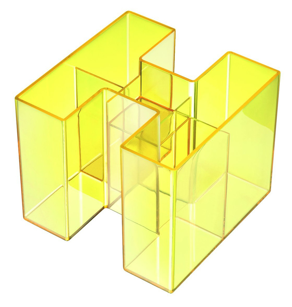 - Ein flaches Fach im Zentrum präsentiert Radiergummi oder Büroklammern