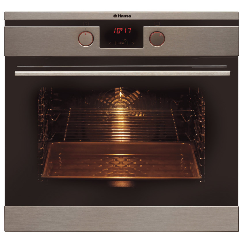 Hansa BOEI67250055. Ofengröße: Medium, Ofentyp: Electric oven, Gesamtes Fassungsvermögen Garraum Ofen: 66 l. Produktfarbe: Edelstahl, Kontrolltyp: Rotation, Berührung, Kontrollposition: Vorderseite. Timer-Typ: Digital. Energie-Effizienzklasse: A, Energieverbrauch (konventionell): 3,1 kWh, AC Eingangsspannung: 230 V. Breite: 595 mm, Tiefe: 575 mm, Höhe: 595 mm