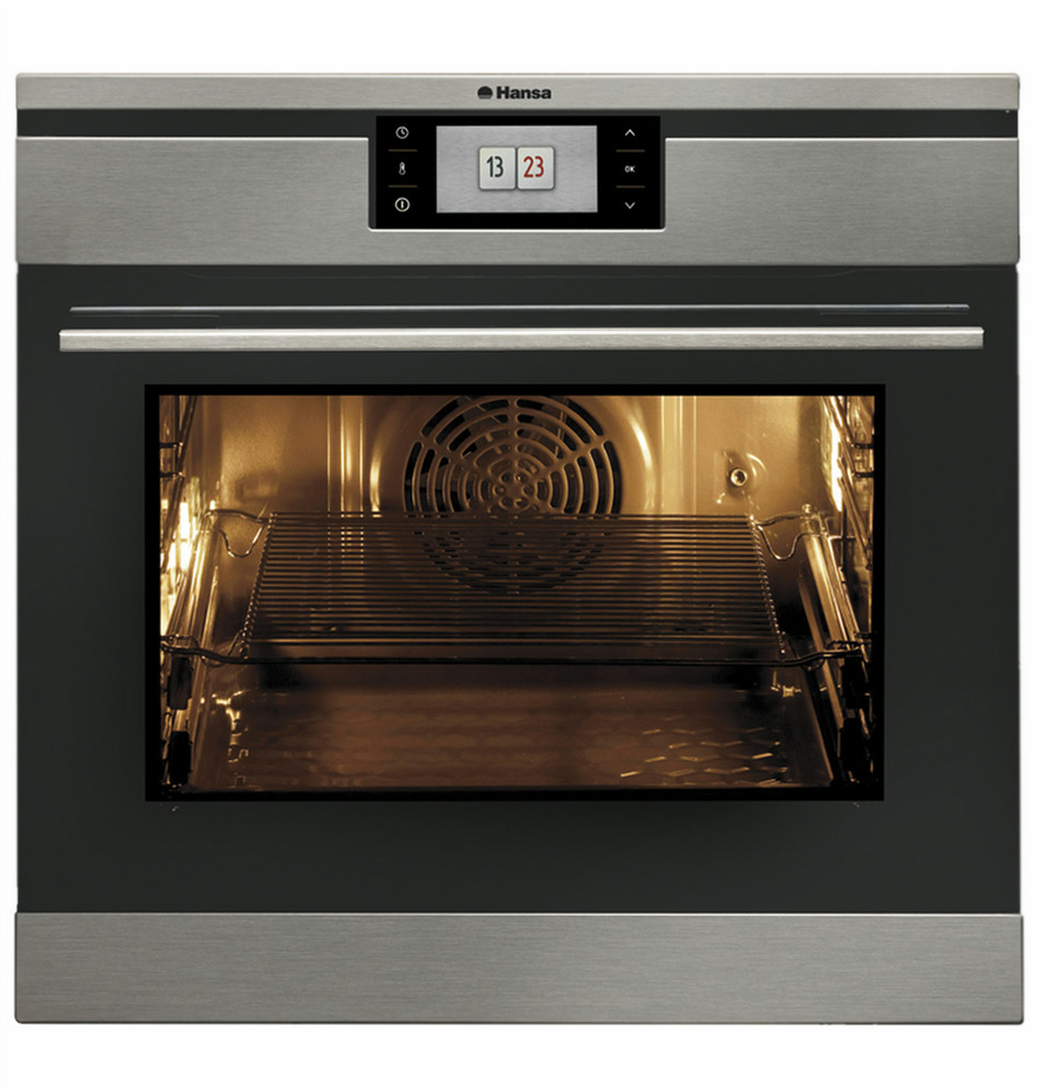 Hansa BOEI69360055. Ofentyp: Electric oven, Gesamtes Fassungsvermögen Garraum Ofen: 66 l, Insgesamt Backofen Leistung: 3100 W. Produktfarbe: Schwarz, Edelstahl, Kontrolltyp: Rotation, Kontrollposition: Vorderseite. Energie-Effizienzklasse: A-20%, Anschlusswert: 3100 W. Breite: 595 mm, Tiefe: 575 mm, Höhe: 595 mm