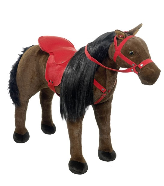 Dieses Pferd ist aus strapazierbarem Synthetik-Plüsch und ist robust Verarbeitet. Mit rotem Sattel und Zaumzeug. Es hat einen Soundchip mit Pferdegeräuschen.