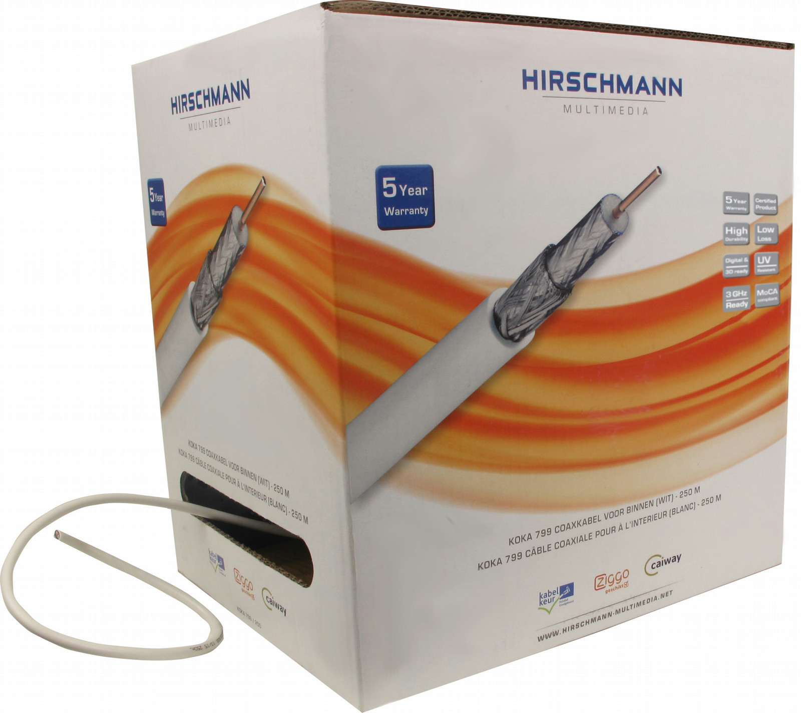 Hirschmann KOKA 799/250. Kabellänge: 250 m, Produktfarbe: Weiß, Äußerer Durchmesser Ummantelung: 7 mm