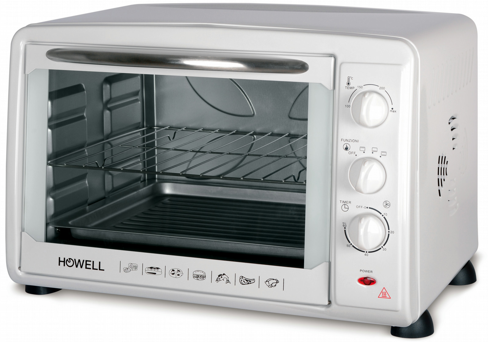 Howell HO.FE3834L. Ofentyp: Electric oven, Gesamtes Fassungsvermögen Garraum Ofen: 38 l, Insgesamt Backofen Leistung: 1600 W. Produktfarbe: Weiß, Kontrolltyp: Rotation, Kontrollposition: Vorderseite. Timer-Typ: Mechanisch. Breite: 495 mm, Tiefe: 360 mm, Höhe: 335 mm