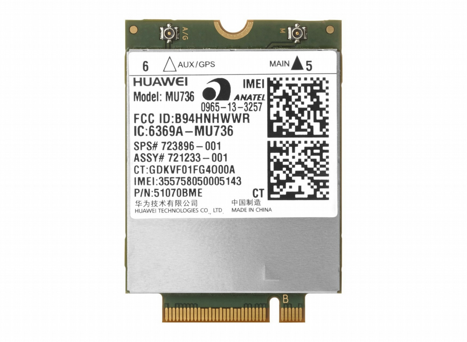 HP hs3110 HSPA+. Datennetzwerk: EDGE, GPRS, HSPA+, UMTS, WCDMA, Unterstützte UMTS-Bandbreiten: 850,900,1700,1900,2100 MHz, Unterstützte GSM-Bandbreiten: 850,900,1800,1900 MHz. Konformität mit Industriestandards: M.2, 3042-S3 B. Breite: 42 mm, Tiefe: 30 mm, Höhe: 2,3 mm