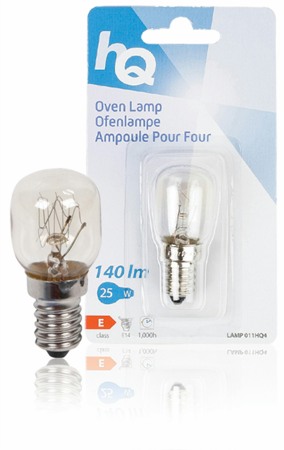 HQ O11HQ4. Lampenleistung: 25 W, Glühbirnengröße: T25, Fassungs-/Sockeltyp: E14. Eingangsspannung: 220 - 240, Energie-Effizienzklasse: E. Verpackungsart: Sichtverpackung, Verpackungsbreite: 80 mm, Verpackungstiefe: 140 mm