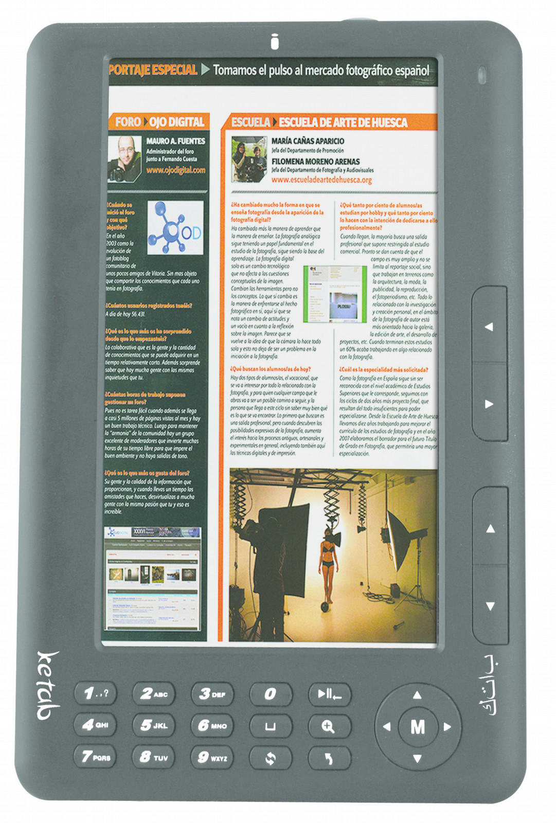 i-Joy Ketab color 7". Technologie: TFT, Bildschirmauflösung: 800 x 400 Pixel. Unterstützte Dokumentenformate: DOC, ePub, FB2, HTML, PDB, PDF, TXT. Kompatible Speicherkarten: SD, SDHC. Schnittstelle: USB 2.0. Menüsprachen: Spanisch