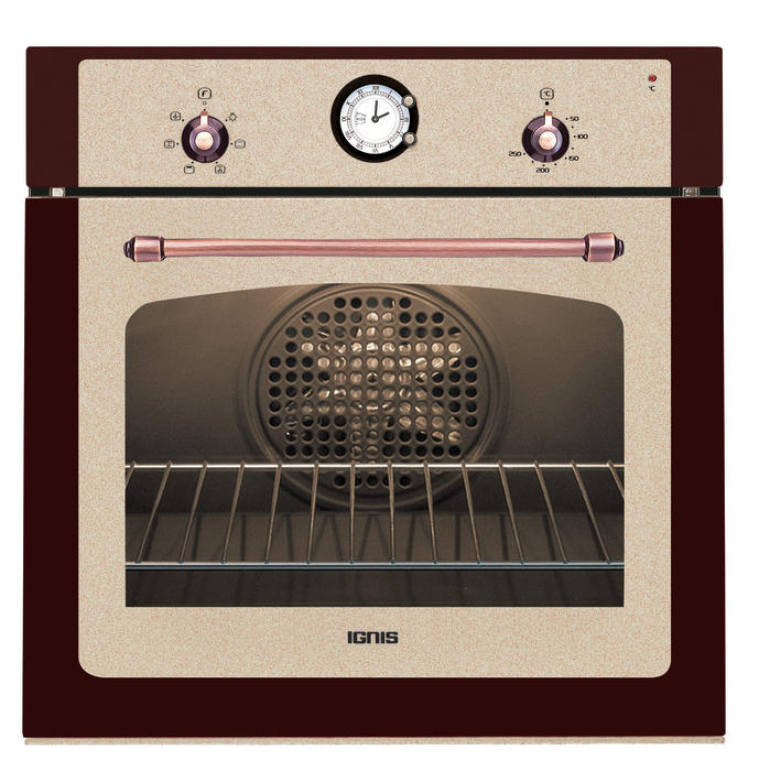 Ignis AKS 236/AE. Ofentyp: Electric oven, Gesamtes Fassungsvermögen Garraum Ofen: 53 l, Innenkapazität des 1. Backofens: 53 l. Produktfarbe: Braun, Kontrolltyp: Rotation, Kontrollposition: Vorderseite. Timer-Typ: Mechanisch. Energie-Effizienzklasse: A, Stromverbrauch (typisch): 2500 W, AC Eingangsspannung: 230 V. Breite: 595 mm, Tiefe: 564 mm, Höhe: 595 mm