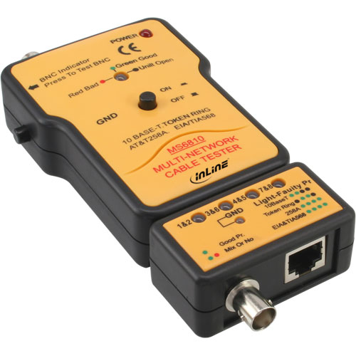Der Multi-Netzwerk-Kabeltester wird im Allgemeinen für Koaxial-, (BNC), UTP- und STP-Kabel genutzt. Er kann automatisch auf unterbrochene Schaltkreise, Kurzschlüsse, fehlerhafte Verdrahtung und Verpolung testen.