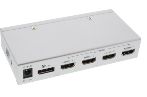 Dieser Video-Splitter ermöglicht den Anschluss von bis zu 4 HDMI Displays an einen DisplayPort Anschluss des PC. Die Anzeige kann dabei geklont oder erweitert werden, also das gleiche Bild auf jedem Monitor oder eine simple Videowand, wo sich die Anzeige auf vier nebeneinander angeordnete Monitore verteilt.