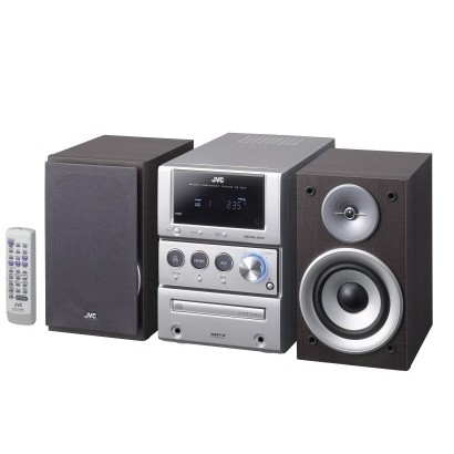 JVC Micro Component System. Typ: Home audio micro system, Zahl der Disks: 1 Disks. Durchmesser Woofer: 10 cm, Hochtönerdurchmesser: 1,5 cm, Signal-zu-Geräusche Verhältnis (SNR): 93 dB. Unterstützte Bänder: AM,FM, Tunertyp: Digital. Gewicht: 4,1 kg, Center Lautsprecher Abmessungen (WxDxH): 140 x 231 x 195 mm, Zentrallautsprecher Gewicht: 1,7 kg. Abmessungen (BxTxH): 165 x 328 x 231 mm, Lautsprecher: 2-way Bass-Reflex