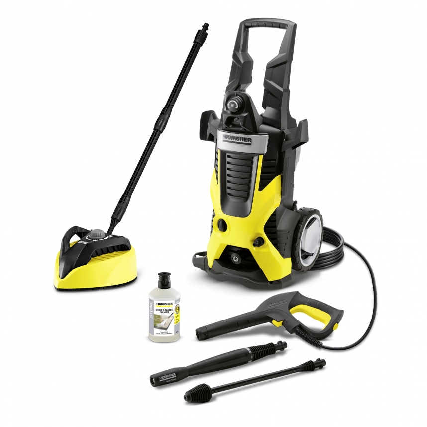 Der „K7 Home“ ist mit einem wassergekühlten Motor ausgestattet und präsentiert sich inklusive Home Kit mit Flächenreiniger T 450 (mit Eckenreinigungsfunktion) zum spritzfreien Reinigen ebener Flächen samt Kärcher Stein- und Fassadenreiniger (1 l). Das Gerät wurde gebaut für häufige Reinigungseinsätze und starke Verschmutzungen wie man sie z.B. von Wegen, Schwimmbecken, Fahrrädern oder großen Autos kennt. Das üppige Ausstattungspaket reicht von einer Pistole mit praktischem Quick Connect-Anschluss über einen 10 m langen Gummi-Hochdruckschlauch und einen zuverlässigen Wasserfilter zum Schutz der Pumpe bis zu einem Vario Power Strahlrohr (VPS) sowie einem Dreckfräser mit rotierendem Punktstrahl. Die Druckeinstellung am VPS lässt sich buchstäblich im Handumdrehen variieren und der Dreckfräser macht selbst hartnäckigsten Verschmutzungen den Garaus.