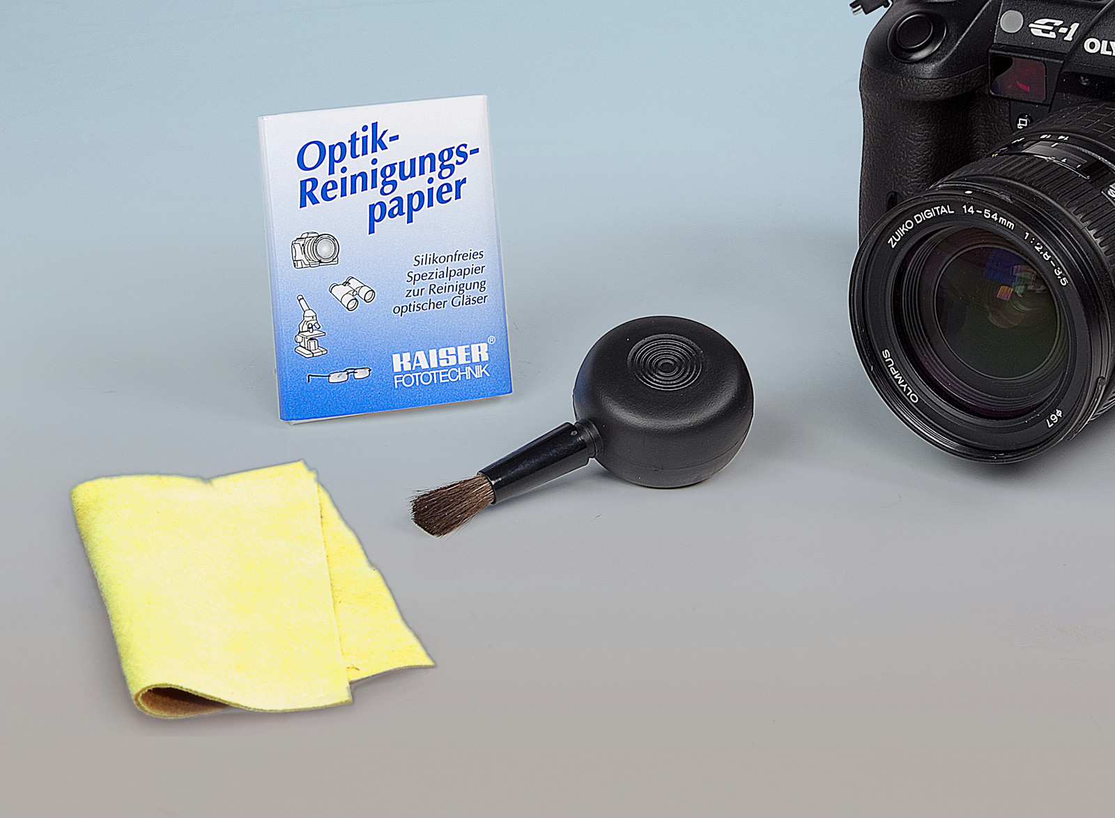 Bestehend aus Optik-Reinigungspapier, Putzleder und Luftpinsel. Für Kameras, Objektive, Ferngläser, Brillen etc.