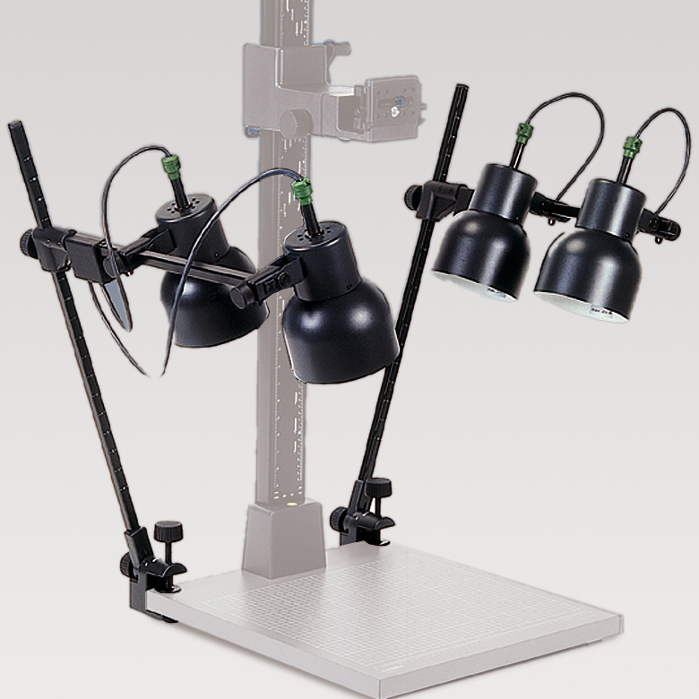 Mit vier Rundreflektoren mit Einschraubfassung E 27, geeignet für Fotolampen bis maximal 250 W. Leuchten einzeln schaltbar, verschiebbar und schwenkbar auf stufenlos höhenverstellbaren Leuchtenträgern. Vertikale Haltearme mit Höhenmarkierungen, schwenkbar in Rastgelenken. Befestigung mit stabilen Druckguss-Klemmsockeln. Spannweite bis 48 mm. Reflektor-Durchmesser: ca. 14 cm. Zuleitung: 2 x 2 m.