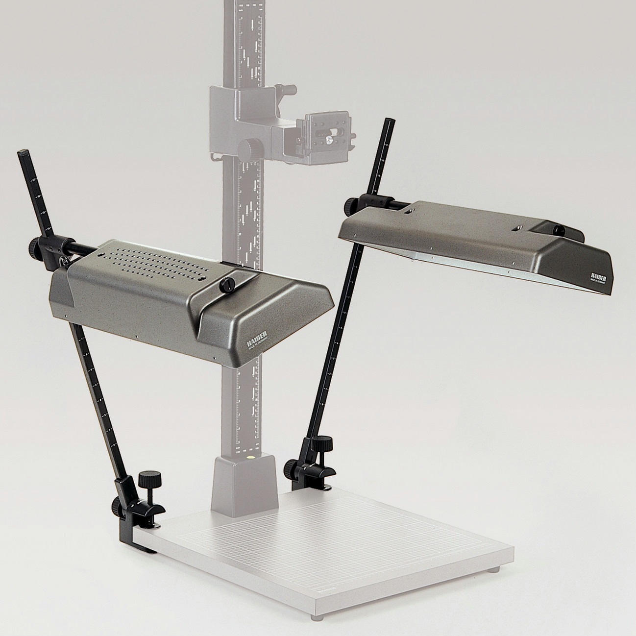 Kaltlichtbeleuchtungseinrichtung mit zwei Flächenleuchten, bestückt mit je einer Tageslichtleuchtstofflampe. Leuchten schwenkbar, Leuchtenträger in der Höhe stufenlos einstellbar. Vertikale Haltearme mit Höhenmarkierungen, schwenkbar in Rastgelenken. Befestigung mit stabilen Druckguss-Klemmsockeln. Spannweite bis 48 mm.