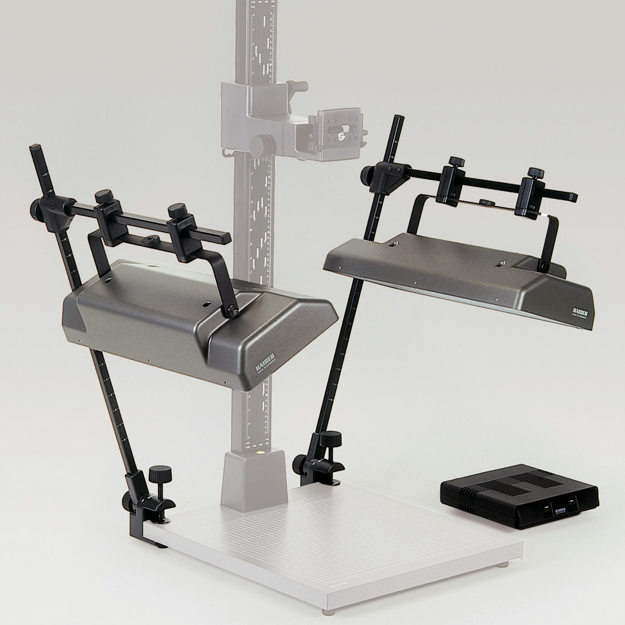 Kaltlichtbeleuchtungseinrichtung mit zwei Flächenleuchten, bestückt mit je zwei Tageslichtleuchtstofflampen. Leuchten schwenkbar und verschiebbar, Leuchtenträger in der Höhe stufenlos einstellbar. Vertikale Haltearme mit Höhenmarkierungen, schwenkbar in Rastgelenken. Befestigung mit stabilen Druckguss-Klemmsockeln. Spannweite bis 48 mm. Separater Schaltkasten.