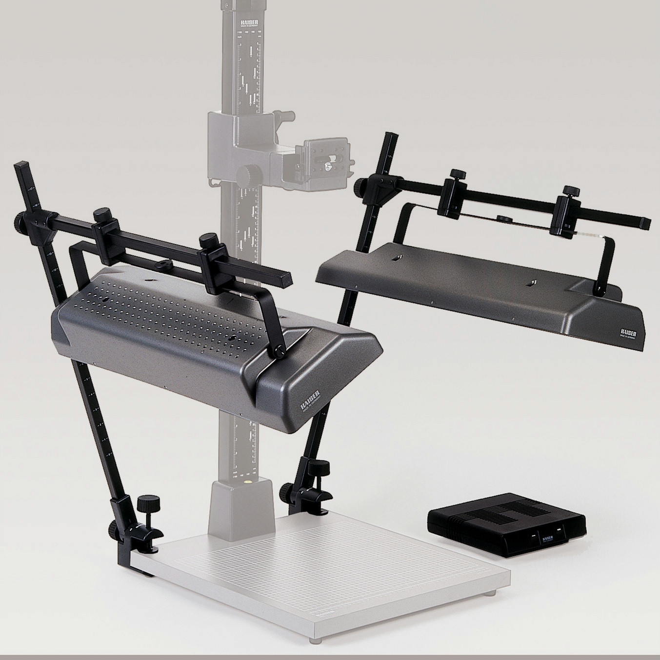 Kaltlichtbeleuchtungseinrichtung mit zwei Flächenleuchten, bestückt mit je zwei Tageslichtleuchtstofflampen, Hochglanz-Innenreflektoren und Hochfrequenz-Betriebssystem. Leuchten schwenkbar und verschiebbar, Leuchtenträger in der Höhe stufenlos einstellbar. Vertikale Haltearme mit Höhenmarkierungen, schwenkbar in Rastgelenken. Befestigung mit stabilen Druckguss-Klemmsockeln. Spannweite bis 48 mm. Separater Schaltkasten.