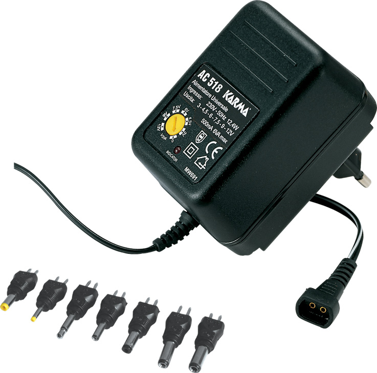 Karma Italiana AC 518. Ausgangsspannung: 12 V. Netzteiltyp: Innenraum, Zweck: Universal, Starkstromtyp: AC-an-DC. Produktfarbe: Schwarz. Breite: 69 mm, Tiefe: 48 mm, Höhe: 60 mm