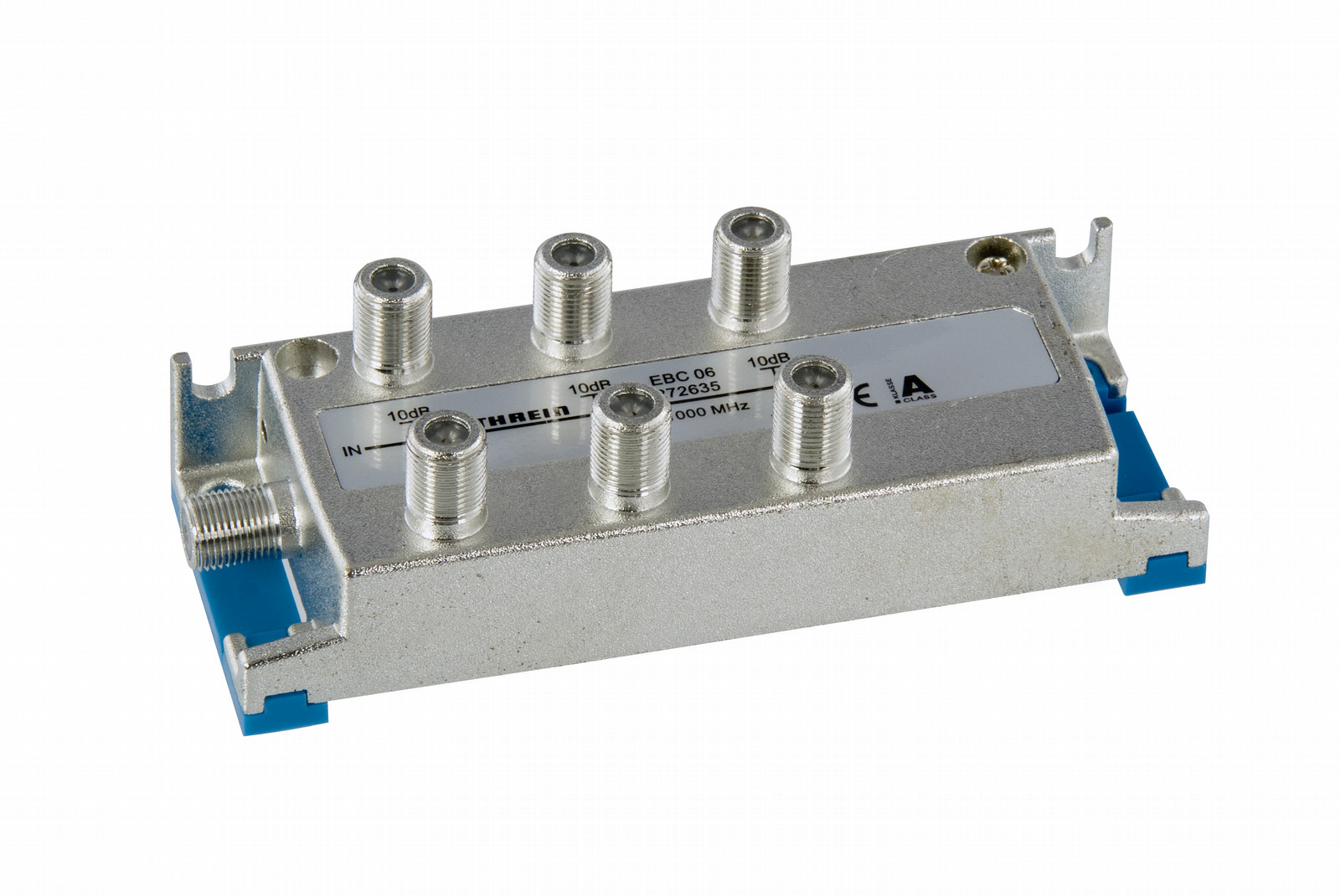 6fach-Verteiler, 5-1000 MHz, F-Connector, Trennkondensatoren an Ein- und Ausgängen, Schirmungsklasse A gem. CENELEC EN 50083-2 Durchgangsd.: 5-40/-470/-862 MHz: 9,3/9,8/10,5 dB, Entkopplung: 5-470/-1000 MHz: >20/18 dB