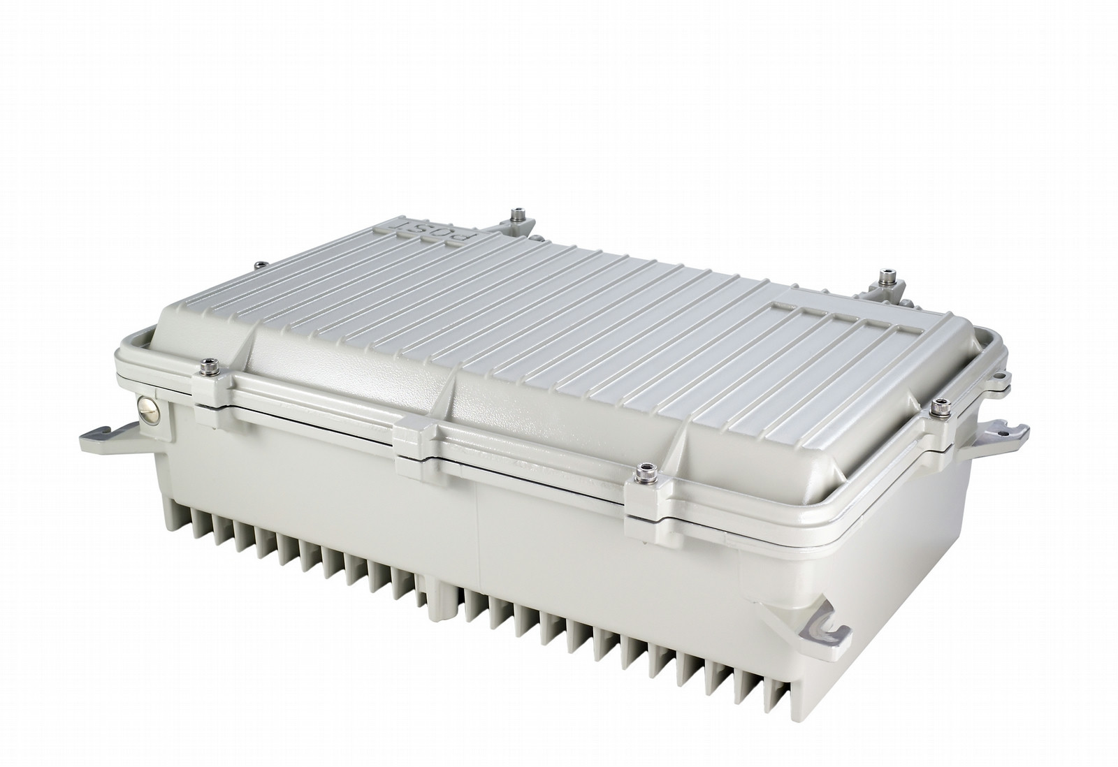 Verstärkergußgehäuse bestehend aus 2 Aluminium- Druckgußschalen zur Aufnahme von max. 12 BK-Modu- len, Fernspeiseweichen und Verteilern.
