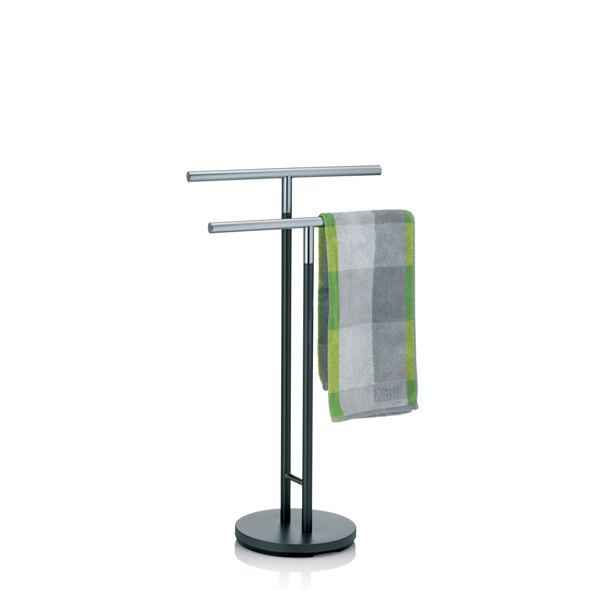 Handtuchhalter aus Metall matt verchromt und einer anthraziten Pulverbeschichtung, 92,5 cm hoch, 51,5 cm breit. Bodenplatte: Ø 30 cm.