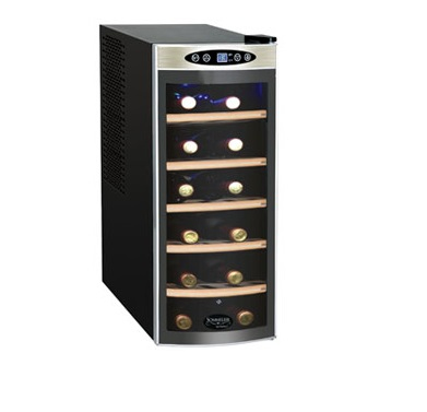 Koblenz EVYK-12M. Bauform: Freistehend, Gehäusefarbe: Schwarz, Anzahl der Regale: 5 Regale. Produkttyp: Thermoelektrische Weinkühler, Kapazität der Flaschen: 12 Flasche(n). AC Eingangsspannung: 115 V, AC Eingangsfrequenz: 60 Hz, Stromaufnahme: 1 A. Breite: 260 mm, Tiefe: 510 mm, Höhe: 650 mm