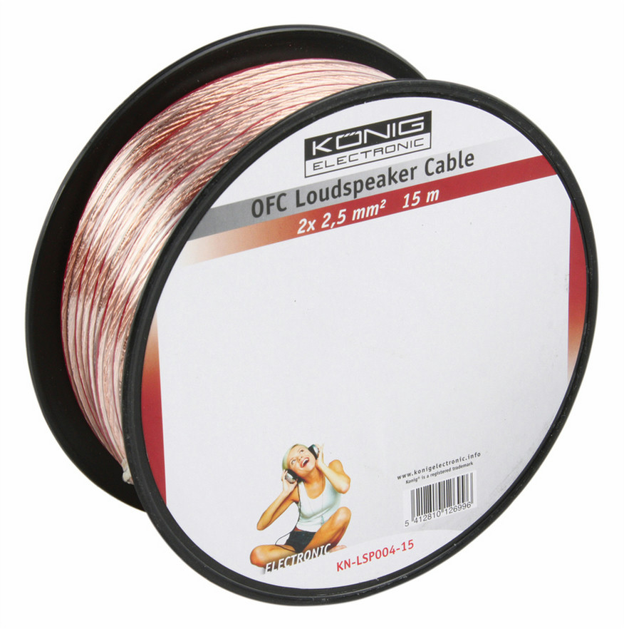 König KN-LSP04R-15. Kabellänge: 15 m, Produktfarbe: Rot, Transparent, Kabelmaterial: Kupfer. Verpackungsbreite: 15,2 cm, Verpackungstiefe: 15,2 cm, Verpackungshöhe: 6 cm