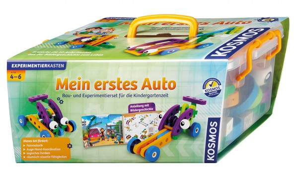 Inhalt: Kosmos-Systembauteile für Kinder ab 4 Jahren: Rahmen, Lochstäbe, Stangen, Räder, 2 Augen, Zahnrad und weitere Teile