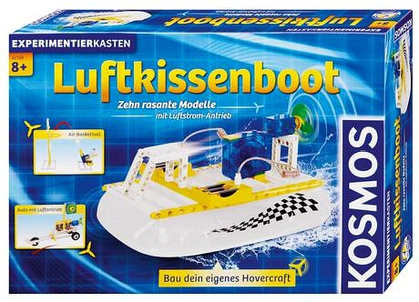 Ein Experimentierkasten voll rasanter Luftstrom-Experimente! 10 Modelle aus Systembauteilen bietet dieser Kasten, mit dem Kinder auf spielerische Weise das Prinzip des Luftstroms untersuchen können. Das Highlight ist ein ca. 30 cm langes Luftkissenboot. Ausgestattet mit Luft-Motor und Luftkissen gleitet es genau wie seine großen Verwandten nicht nur über glatte Oberflächen an Land, sondern auch über ruhiges Gewässer. So wird die heimische Badewanne schnell zum Experimentierlabor!