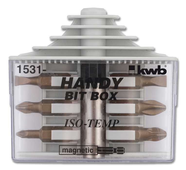 Handy Bit-Box ISO-TEMP, Antrieb 1/4" Sechskant nach ISO 1173, C 6.3, hohe Zähigkeit, spezial Bit für den Einsatz in hartem Schraubfall, spezial gehärtet, deutlich reduzierte Bruchgefahr, ACR Spitze, die Rippen der Klingenspitze verhindern das Herausrutschen der Klinge aus der Schraube und reduzieren damit den Anpressdruck, Bithalter mit Dauermagnet, Federring, Sechskantschaft 1/4" Aufnahme nach ISO 1173, E 6.3, patentierte Bit-Box auch als Handschrauber einsetzbar.