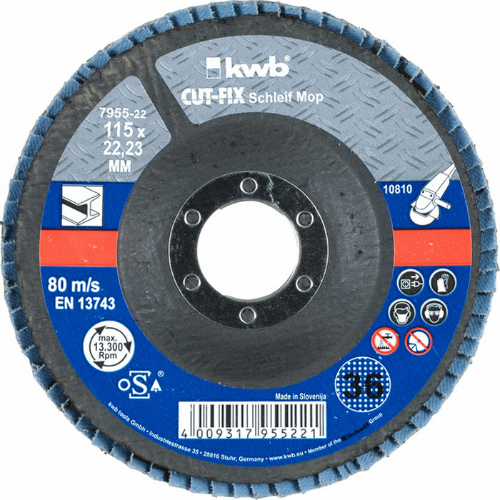 Schleifmop, Lamellenschleifteller, Metallbearbeitung, Ø 115 x 22 mm, 36 Körnung, 13300 rpm