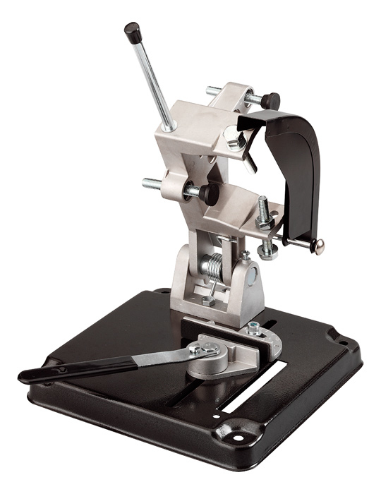 Winkelschleiferständer, Seitenschutz der Trennscheibe, Rückholfeder, schwere Ausführung, mit stabiler Grundplatte, Einspannvorrichtung für Werkstücke, geeignet für alle handelsüblichen Winkelschleifer.