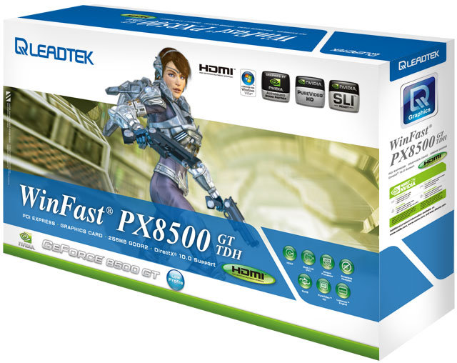 PCIe 16x/ NVIDIA/ GeForce 8500GT/ 256 MB/ DDR2/ 128 Bit/ GPU 490 MHz/ 800 MHz/ VGA, HDTV-Out, DVI/ Features: SLI, HD Ready/ Noiseless Heatpipe/Retail