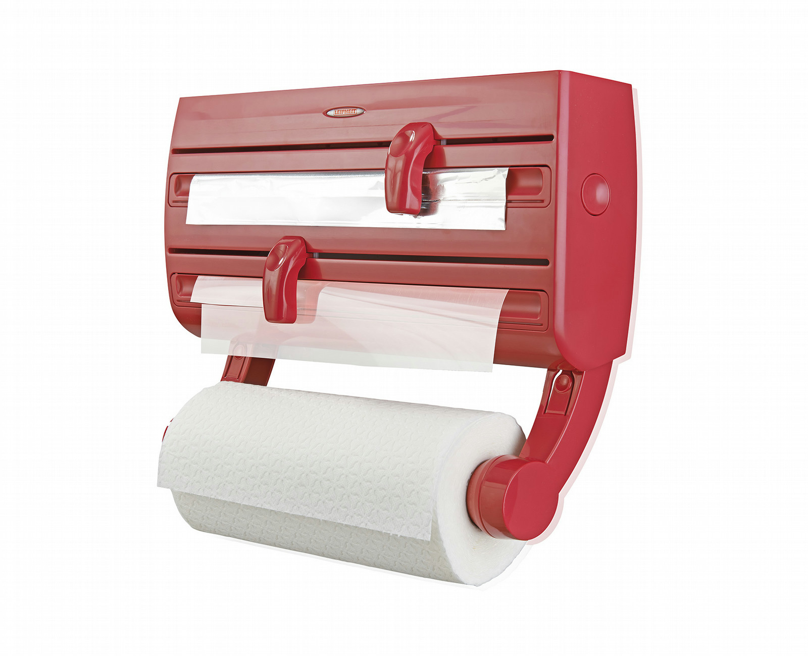 Schön, wenn alles mit einem Griff zur Hand ist: Alu- und Frischhaltefolie, Küchenrolle, Gewürze. Alles findet im Wandrollenhalter Parat F2 in der limitierten Farbe rot seinen Platz. Auf der praktischen Ablagefläche lassen sich Gewürze abstellen, in zwei geschlossenen Behältern befinden sich Alu- und Klarsichtfolie und die Küchenrolle ist auf einer dritten Halterung jederzeit griffbereit. Diese ist abnehmbar und mit einer integrierten Bremse ausgestattet. So lässt sich die Küchenrolle mit nur einer Hand Blatt für Blatt kontrolliert abreißen. Ebenso praktisch sind die messerscharfen Spezialklingen, die die Alu- und Frischhaltefolie sauber und präzise abtrennen. Ohne schiefe, zerrupfte Abrisskante und ohne Gefummel an der Klarsichtfolie, weil der Anfang nicht zu finden ist. Nach dem Schneiden ragen die Rollenenden weit genug aus dem Rollenhalter heraus, um sie beim nächsten Mal mühelos greifen und herausziehen zu können. Die Klingen sind verletzungssicher hinter den ergonomisch geformten Schneidschiebern verborgen. Nach der einfachen Wandmontage lässt sich der Wandrollenhalter schnell und bequem von vorn bestücken. Geeignet ist er für alle handelsüblichen Rollenmaße. Die Bohrlöcher passen zudem auf alle Leifheit Parat Modelle. Inklusive Dübel und Schrauben. Die Garantiezeit beträgt 3 Jahre.