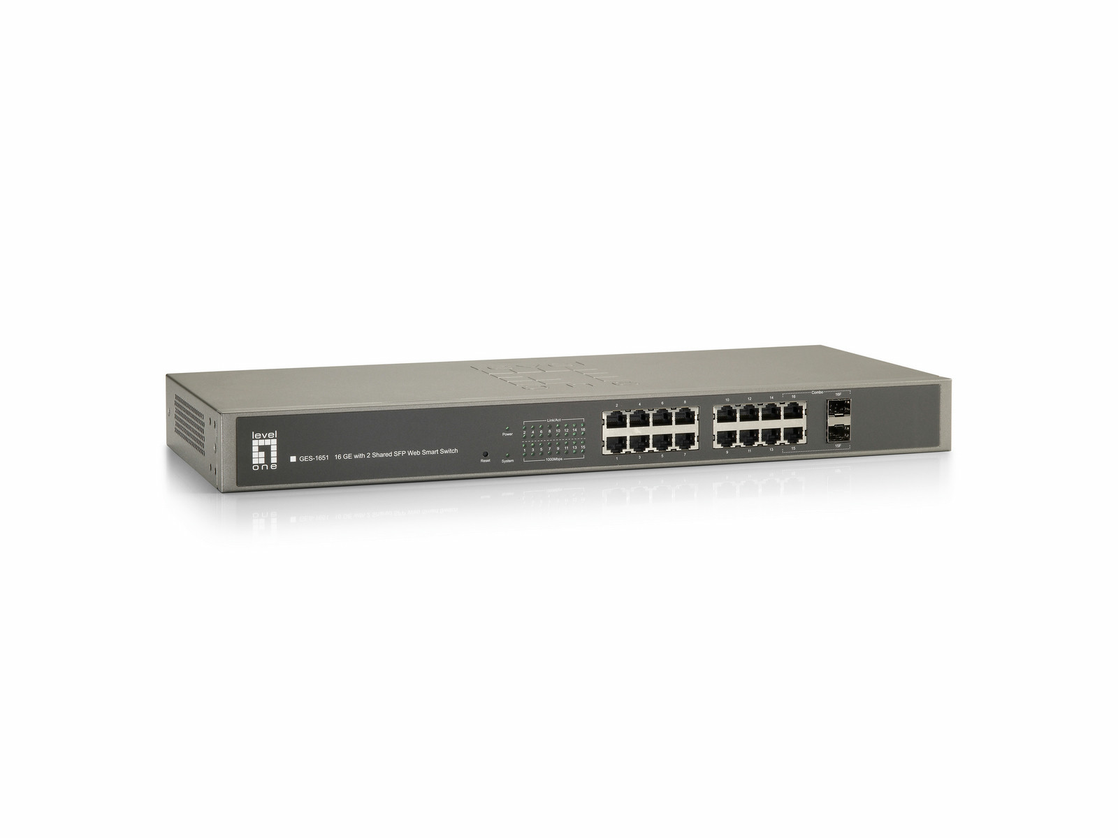 - 16 Gigabit Ethernet Ports mit 2 gemeinsam nutzbaren SFP-Slots