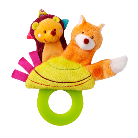 Die Fingerpuppen Victor und Simon sitzen voller Freude auf ihrem Beißring. Der Fuchsschwanz hält den Schnuller des stolzen Eigentümers fest umklammert.
