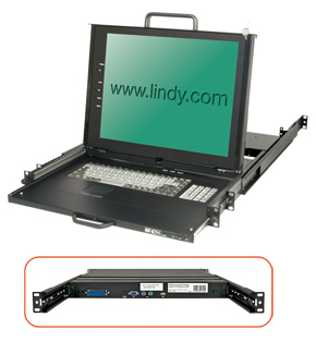 -Das LCD Display kann unabhängig von der Tastatur herausgezogen und vor dem 19" Rack hochgeklappt werden, so dass bei Bedarf die Schranktüren bei aktivem Monitorbild verschlossen werden können.