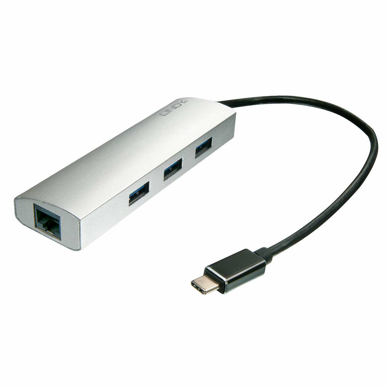 - Stellt drei USB Typ A-Ports und eine Gigabit Ethernet-Schnittstelle zur Verfügung