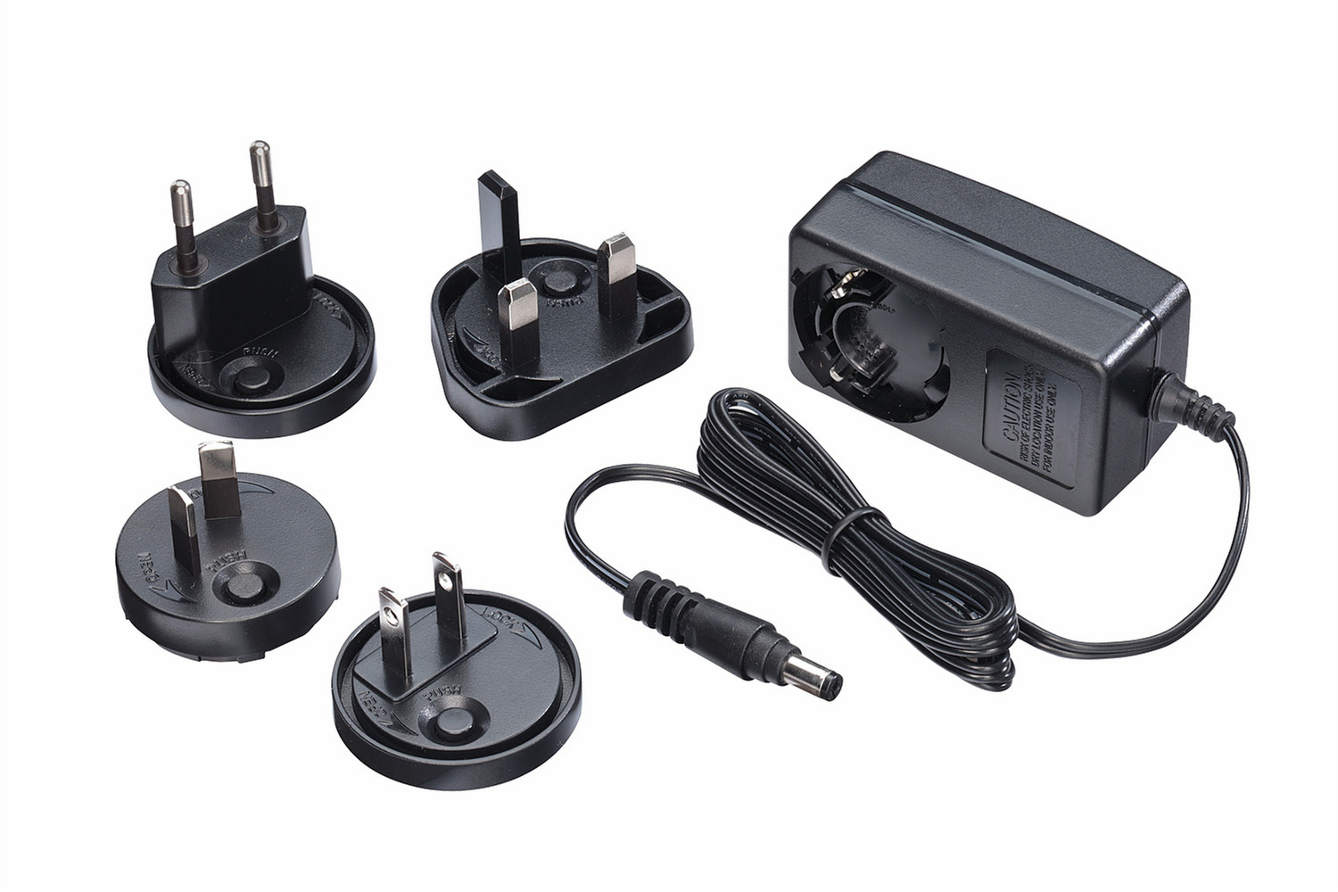 Beinhaltet 4 austauschbare Netzstecker für Europa, Großbritannien, Nordamerika und Asien.
