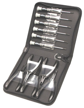 Werkzeugmappe mit folgenden Werkzeugen: - 2 x Seitenschneider - Flachzange schmal mit 45° Abwinkelung - Flachzange mit Schneidklinge - Rundspitzzange - 3 x Kreuzschlitz-Schraubendreher - 3 x Schlitz-Schraubendreher
