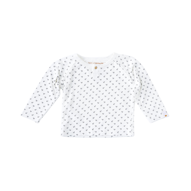 Henley Shirt für Baby Jungen in off-white Jersey mit schwarzem Allover-Anker-Print. Am Halsausschnitt dieses langärmeligen Jungenshirts wurde ein Holzknopf verarbeitet. Das Shirt kann so getragen werden, passt aber auch über ein Hemd oder T-Shirt.
